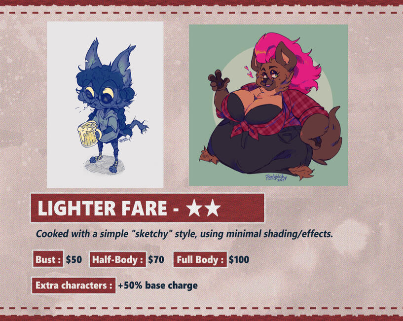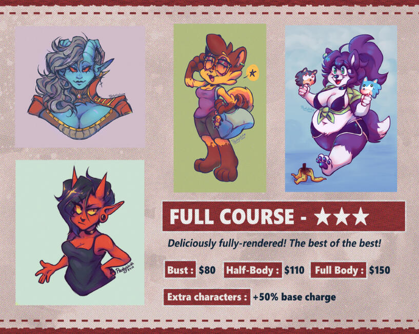 Payment for commissions will be delivered in advance through a PayPal invoice, with 100% of quoted fee paid (unless an alternate payment plan is agreed upon by both parties). Plentyblush (the artist) will not begin work until the payment is received in full.The invoice, once created, has a deadline of 5 days (extensions to this must be noted BEFORE the deadline is reached). Please note that highly-complex characters (including weapons, armor, multiple sets of wings/horns, multiple limbs, etc.) may render an additional 20% surcharge, which will be discussed before an invoice is sent.A 20% discount may be applied to the commission if one or more characters belong to Plentyblush (characters may be found via Toyhouse library ), or was designed by them as an adoptable or previous custom-design commission. Proof of purchase of the adoptable/design may be requested to confirm discount eligibility.
